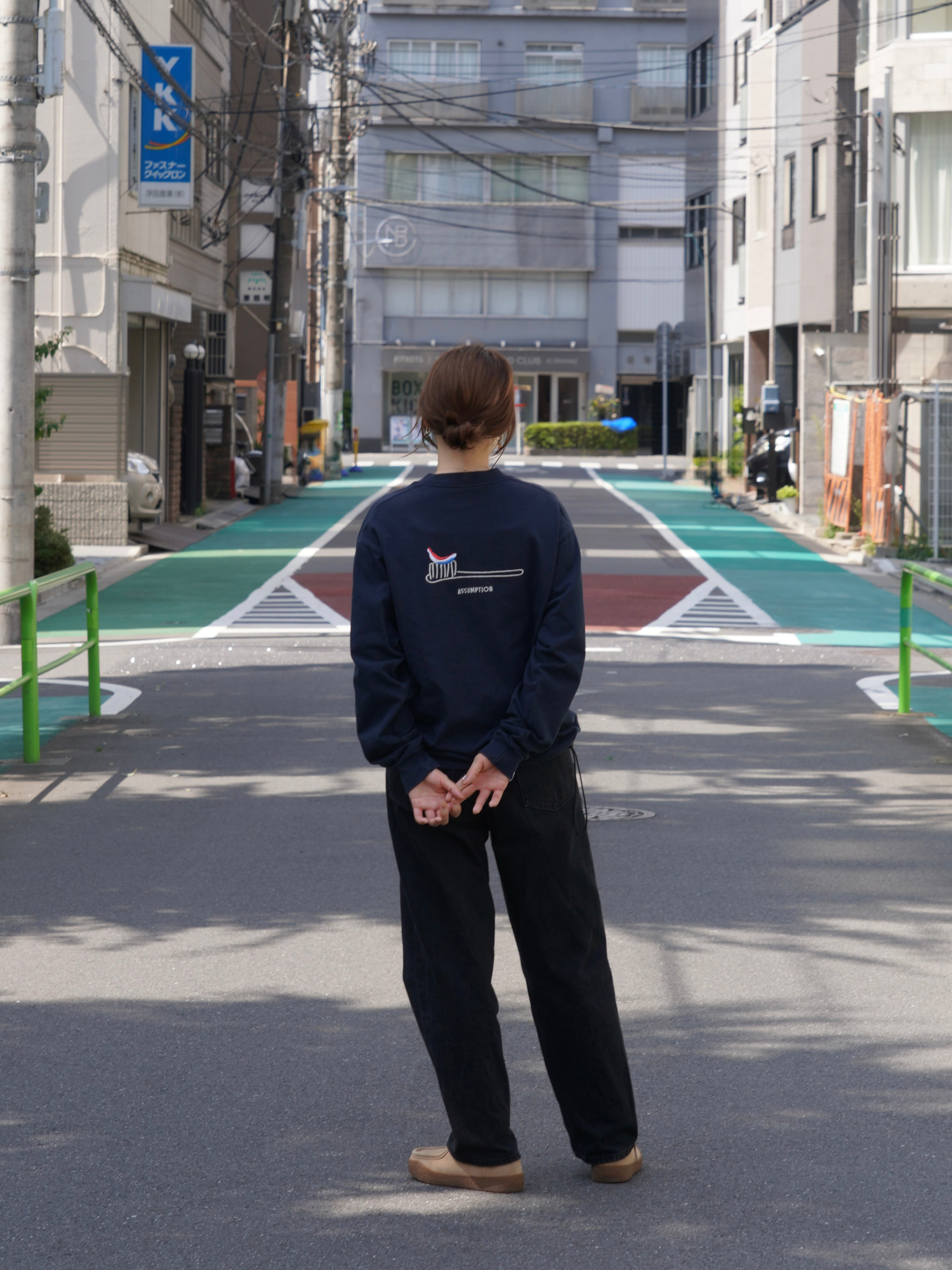 首がやや詰まっていてきちんと感のある雰囲気とリラックスシルエットに歯ブラシのデザイン。