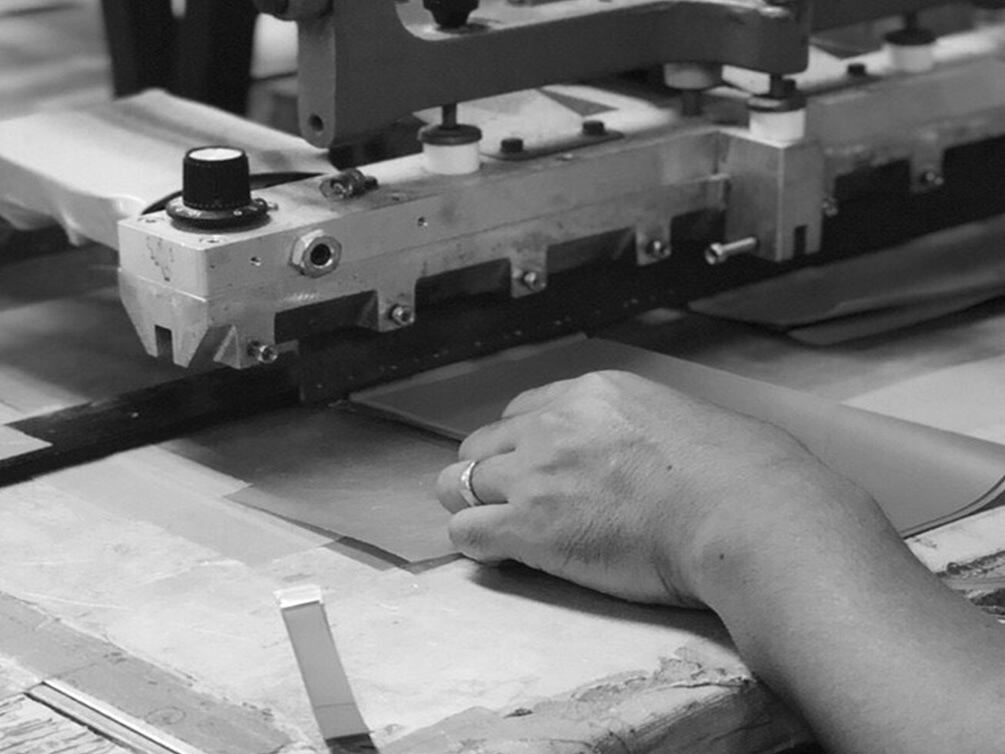 足立区の職人さんに溶着加工をしてもらったのち、最終工程のボタン付けやプリントは店舗兼工房で1つ1つ手作業で仕上げています。